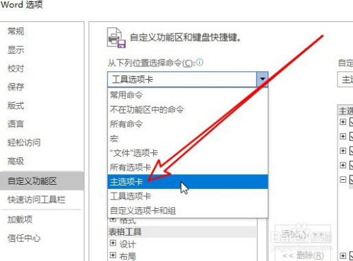 接下来在右侧窗口点击从下各位置选择号令下拉按钮,选择本家儿选项卡菜单项。