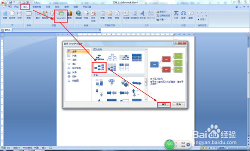 点击插入——然后在插图中点击SmartArt——点击程度条理布局——点击确定。