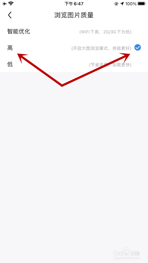 跳转新页面后,查找并点击“高”,右侧打勾就能将浏览图片质量变为高质量,从而进入大图浏览模式。