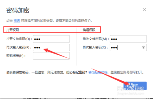 在密码加密界面,按照需要进行加密类型的选择并输入密码,点击应用。