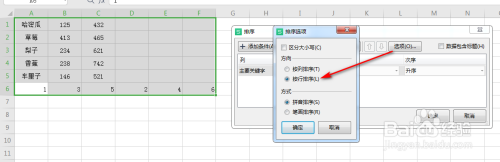 在弹出的对话框中,点击“选项”,在呈现的弹出框中,选中“按行排序”,具体如图所示: