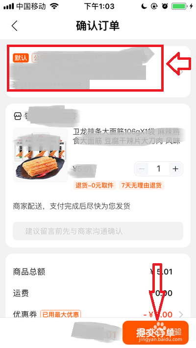 在确认订单页,我们选择收货地址,默认显示的是默认收货地址。然后点击右下角的【提交订单】