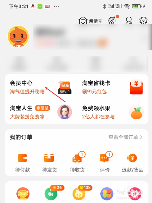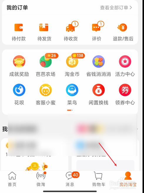 在淘宝东西栏中打开我的淘宝页面。
