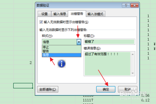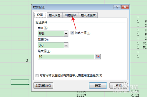 在弹出的“数据验证”对话框中,切换到“犯错警告”选项卡。