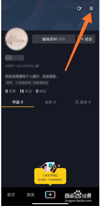 登录抖音APP;在我页面上方点击【三】。