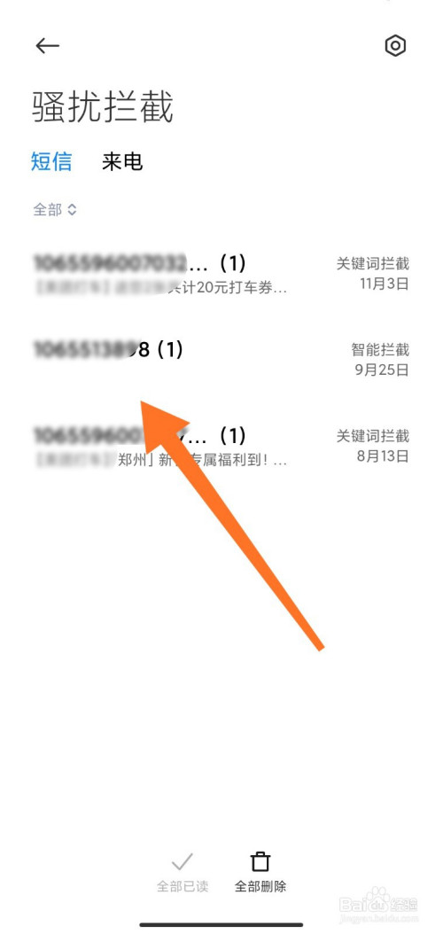 进入骚扰阻挡界面,可以查看被阻挡的短信列表,点击短信;