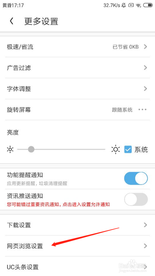 在更多设置页面中,点击网页浏览设置选项。