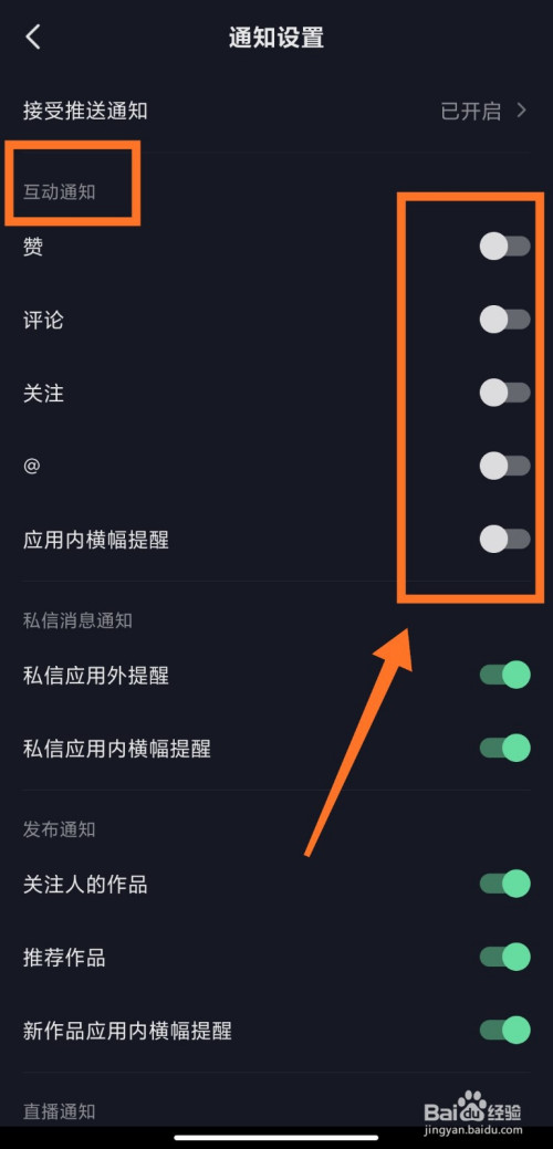 在通知页面,找到互动通知,封闭赞、评论、存眷、@、应用内横幅提醒动静通知,互动动静封闭当作功。