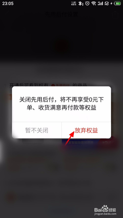 【2】点击 详情>封闭先用后付>抛却权益,封闭当作功。