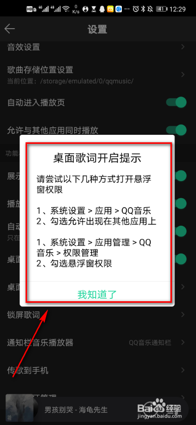 - 5查看桌面歌词开启提醒,点击知道了即可。