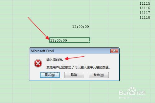 返回编纂区,在设置好的单位格中输入“许可输入时候的区间规模”之外的时候,会有错误提醒,申明设置当作功。