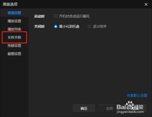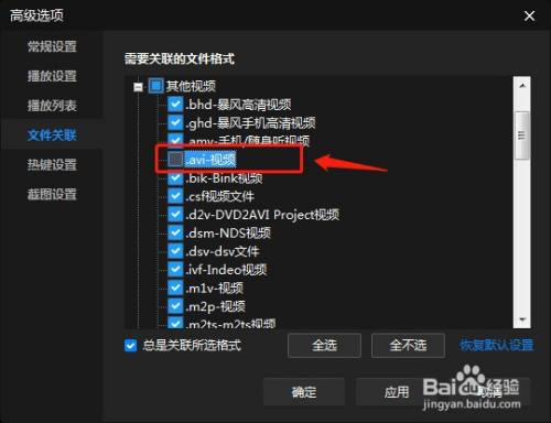在【文件联系关系】选项卡右边的需要联系关系的文件格局列内外有一个【.avi-视频】的勾选项,默认是不勾选的