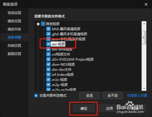 勾选【.avi-视频】的勾选项,最后点击下面的【确定】即可