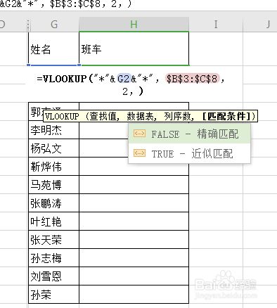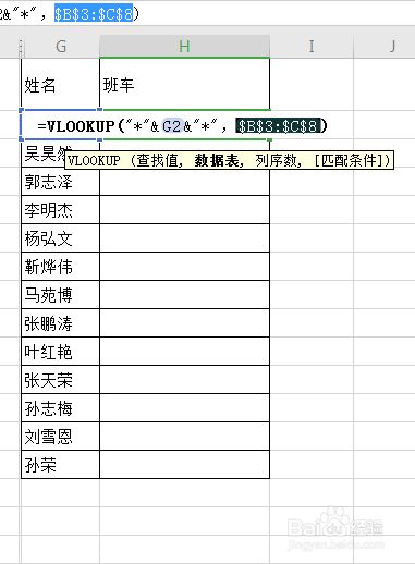 VLOOKUP函数的第一个参数是查找值,因为在班车信息表中,人员姓名都放在一个单位格中了,所以这里我们利用通配符来编制查询前提,第一个参数为"*"&G2&"*" 。