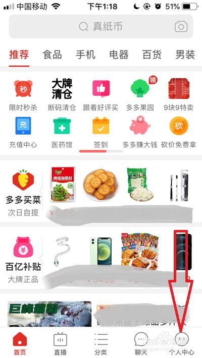 打开拼多多后,点击拼多多首页右下角的【小我中间】