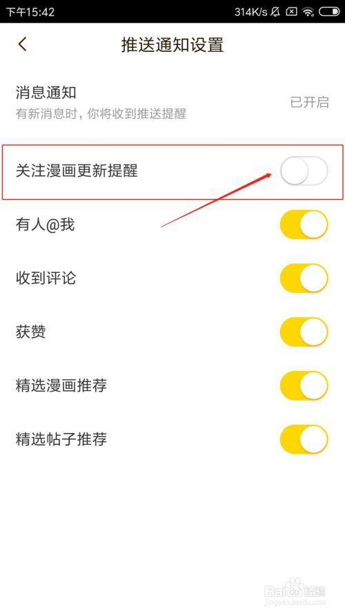 在推送通知设置页面中,点击存眷漫画更新提醒后面的开关。