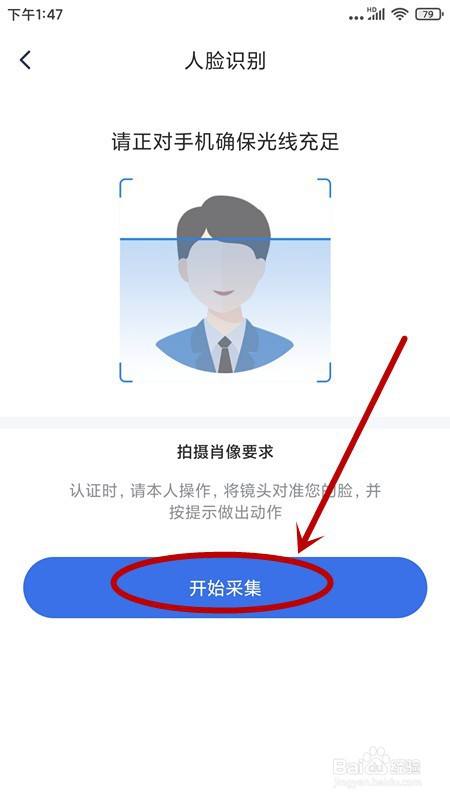 支付宝当作功授权后,还有进行人脸识别。点击【起头采集】