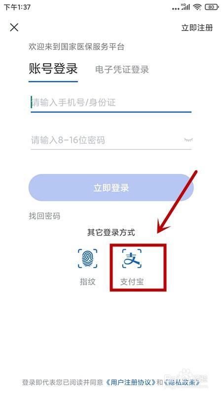 进入登录页面后,若是没有平台账号,一般需要点击右上角的【当即注册】去注册账号。若是我们手机上安装有支付宝,我们可以节流注册环节,点击【支付宝】,经由过程支付宝账号登录