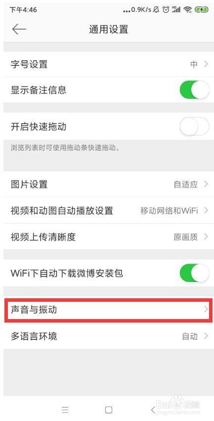 在“通用设置”选项卡的就能找到“声音与振动”这个选项,在这里就可以设置微博手机APP声音与振动功能了,快去尝尝吧!
