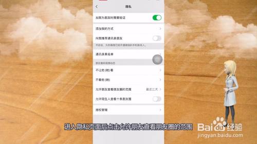 5、进入隐私页面后点击许可伴侣查看朋友圈的规模。