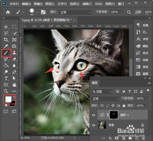 接着,我们用白色的画笔涂抹眼睛部门,这时曲线蒙版中会呈现两个小白点,如图所示。