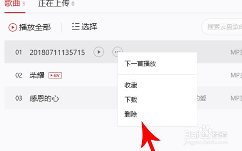 7、试听本身的歌曲后发现上传错了,或者想要删除从头上传的时辰,点击歌曲后面“...”后,再点击“删除”,这样他就会被删除失落了。