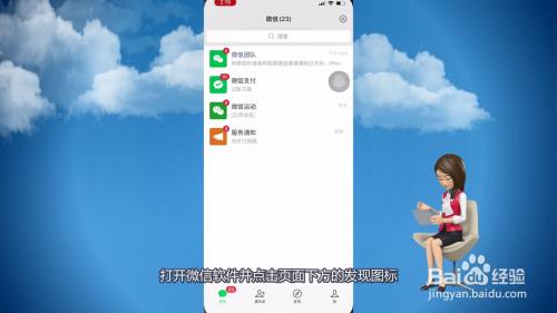 1、打开微信软件并点击页面下方的发现图标。