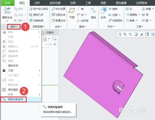 首先我们要将导入的实体模子转换为钣金零件,模子选项卡下,点击“操作”右侧的黑色箭头,睁开的菜单中点“转换为钣金件”,启动钣金转换指令。