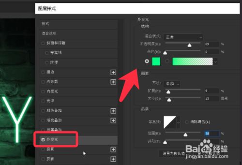 双击文字图层打开图层样式面板,勾选外发光,参数如下图。