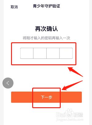然后在【青少年守护验证】界面,输入两次不异密码设置守护密码,如图;