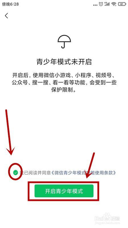 在弹出页面,勾选【我已阅读并赞成《微信青少年模式功能利用条条目》】后,点击【开启青少年模式】