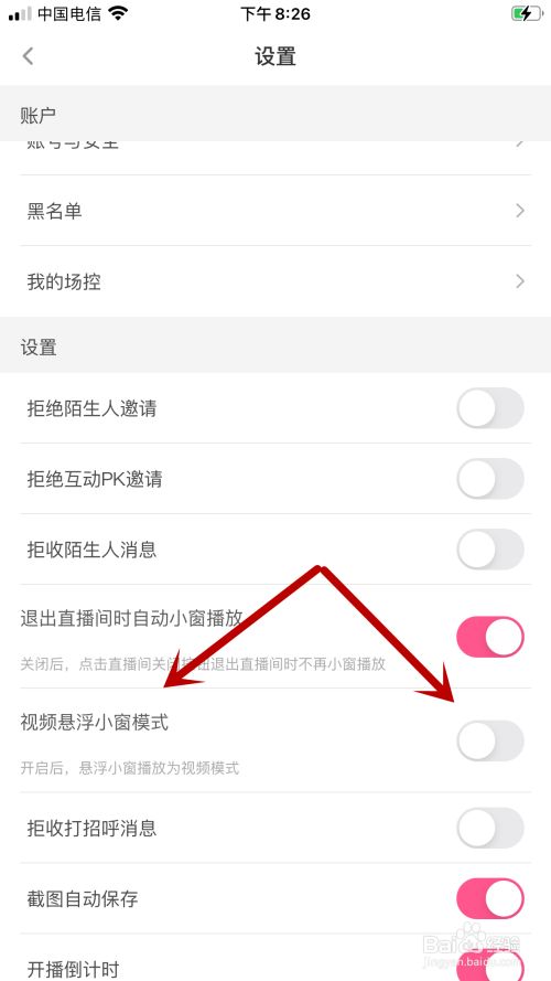 点击视频悬浮小窗模式后方的开关。