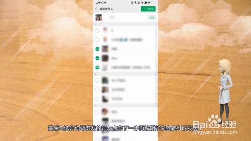 8、最后勾选好您要群发的老友点击下一步再编纂好内容就可以发送了。
