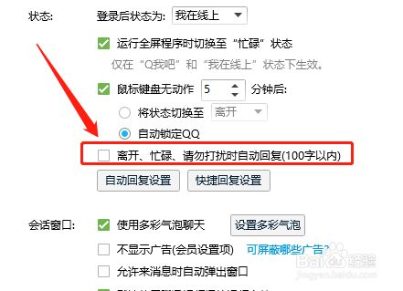 3.最后,打消勾选“分开、忙碌、请勿打搅时主动答复”选项即可。