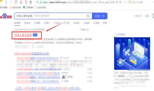然后再在百度搜索框输入“中国人事测验网”,按照搜刮成果,点击进入官网;
