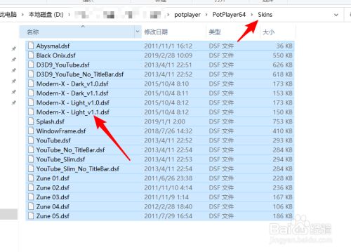 打开的文件夹即为potplayer皮肤文件夹,将下载的皮肤文件,一般.dsf后缀,复制skins目次即可。