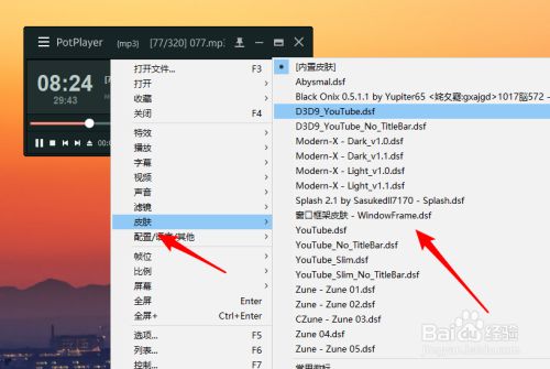在potplayer界面右键选择【皮肤】,就可以看到添加的自界说皮肤了,单击选择即可看到新皮肤结果。