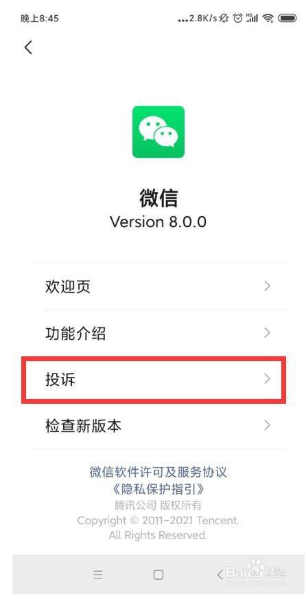 在“关于微信”选项卡的就能找到“投诉”这个选项,在这里就可以经由过程微信APP进行投诉了,快去尝尝吧!