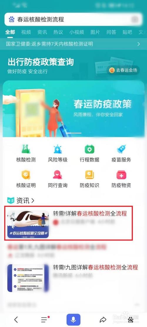 点击顶部的搜索框,搜刮“春运核酸检测流程”。