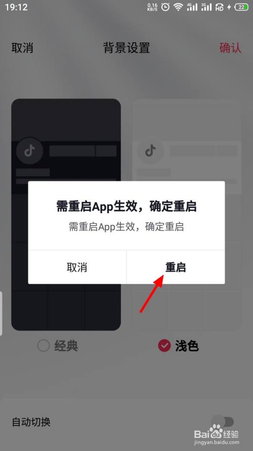 呈现“需重启APP生效,确定重启”提醒,点击【重启】,这样就设置为淡色布景了。