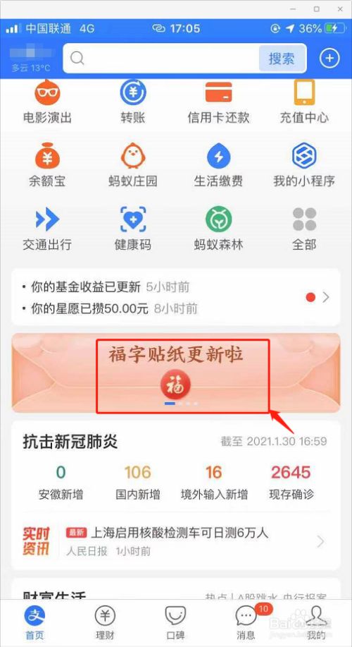 在支付宝本家儿页,选择【福字贴纸更新活动】,并进入。