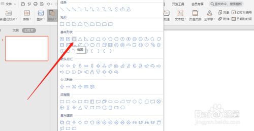WPS演示中建造齐心圆型图文排版,选择椭圆,如图所示。