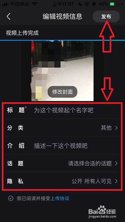 输入视频题目、介绍等信息后,我们点击右上角的【发布】即可完当作在优酷上的视频发布。