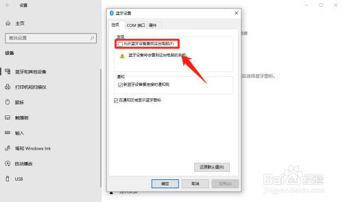 在“蓝牙设置”对话框中,勾选“许可蓝牙设备查找这台电脑(F)”选项的勾选开关。
