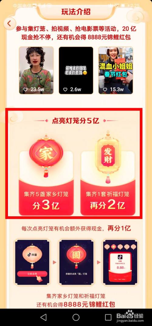 1.点亮灯笼分5亿,集齐5盏家乡灯笼分3亿,集齐1套祈福灯笼再分2亿,好运连连,有机遇获得8888元锦鲤现金红包