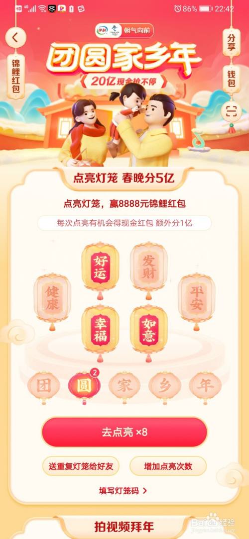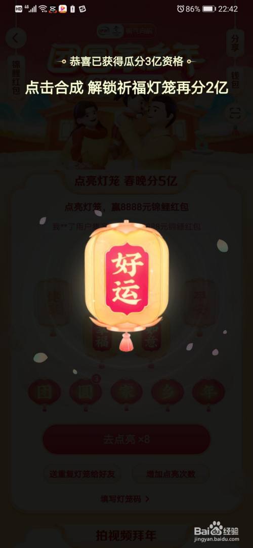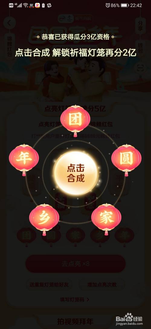 我们打开抖音,首先先获得我们的5个灯笼团聚家乡年,都获得了之后,点击一下合当作选项。
