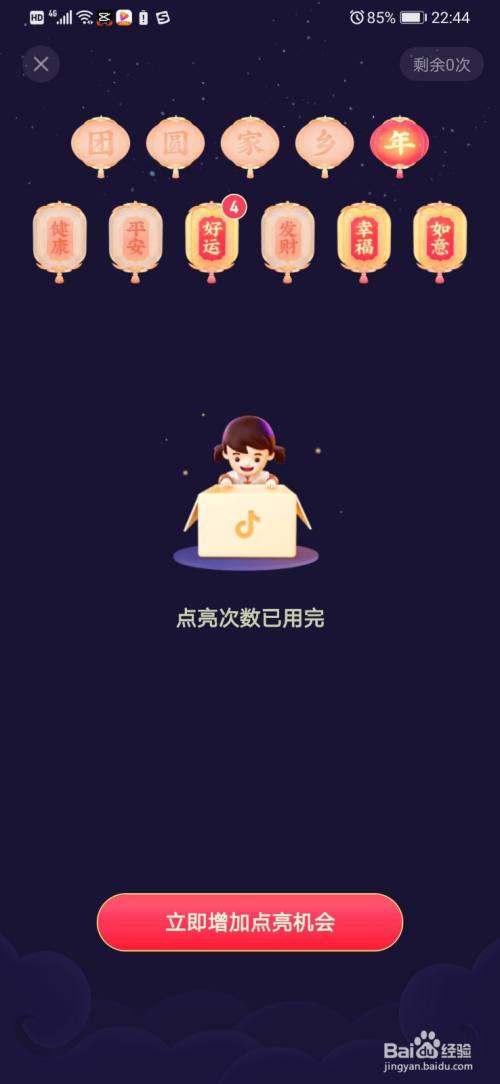 而当我们没有祈福灯笼可以解锁之后,系统就会提醒我们去获得点亮的机遇和次数,我们按照提醒操作即可。