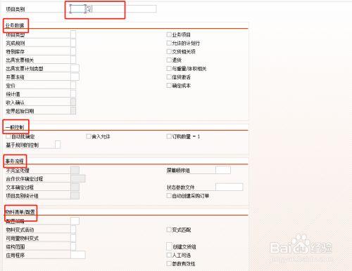 输入项目类别号称和描述,维护营业数据、一般节制、事务流程、物料清单/设置装备摆设的参数设置