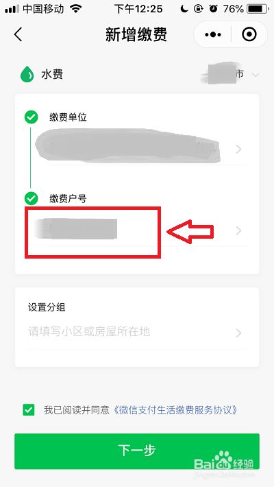 输入了户号后,我们在【我已阅读并赞成《微信支付糊口缴费办事和谈》】前打钩,最后点击【下一步】