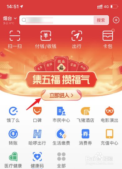 进入支付宝后,点击本家儿界面的活动进口进入。